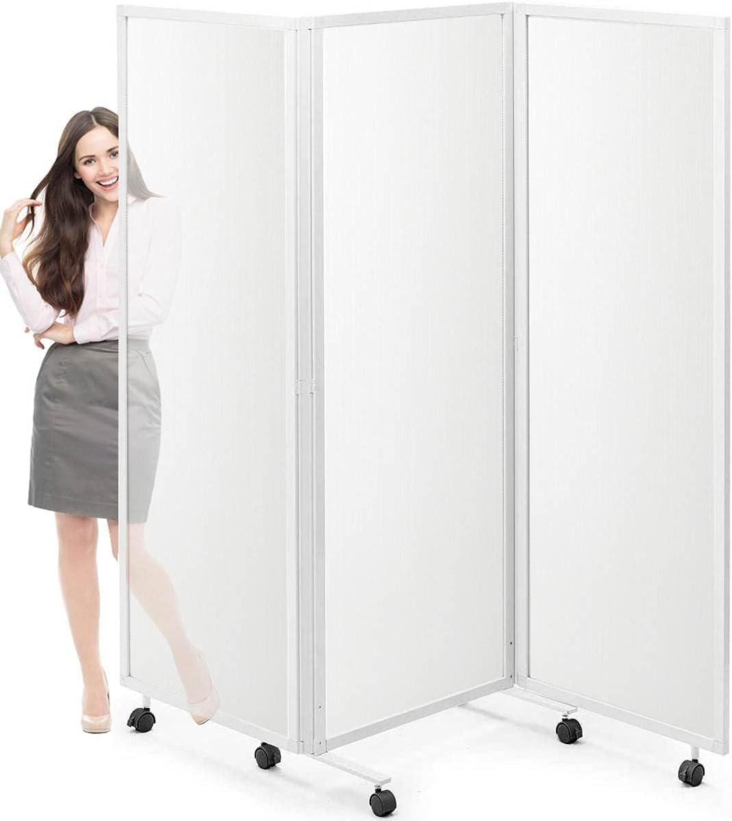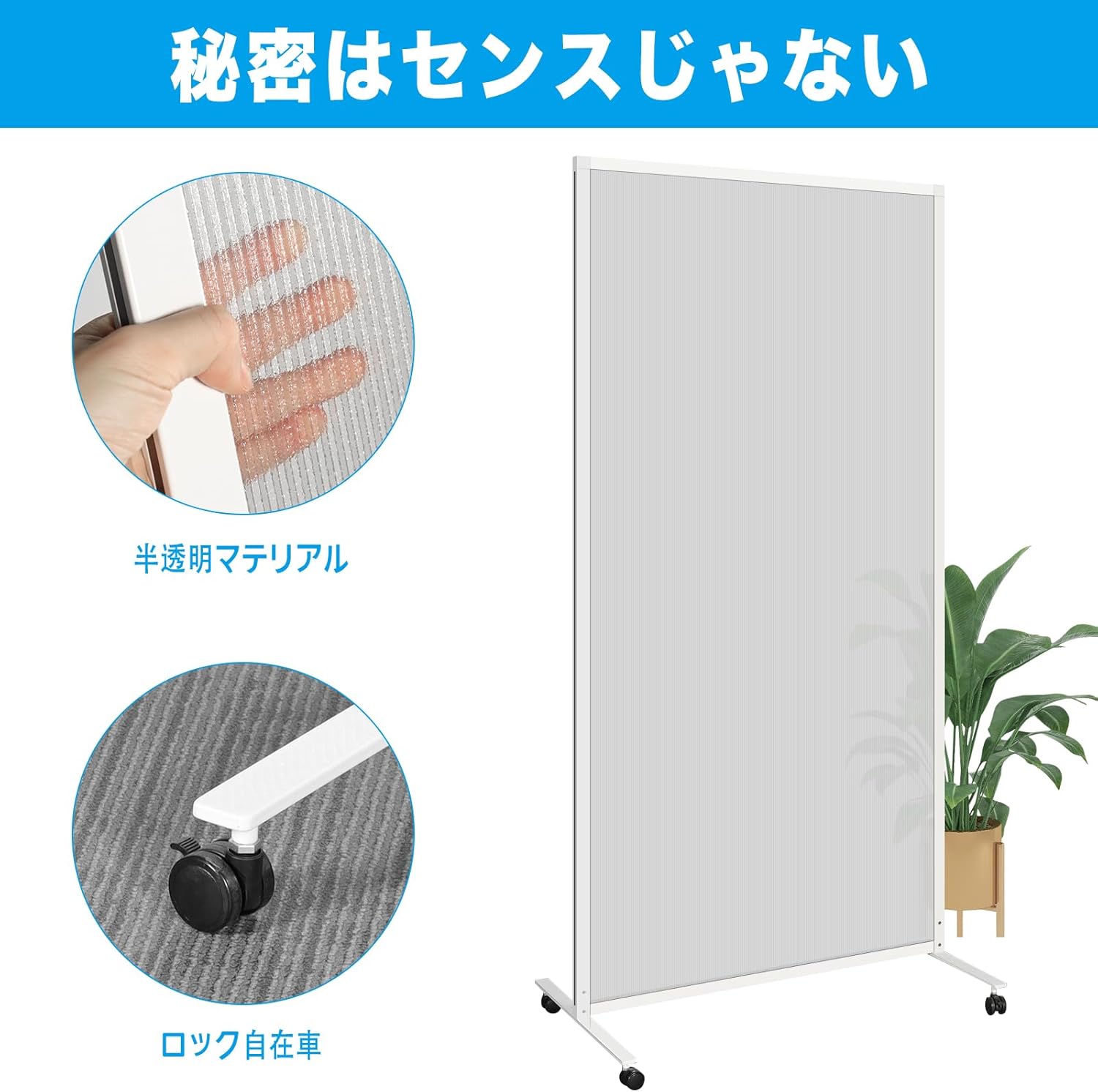 光を取り込み明るさを損なわない:光を通し開放感がある半透明のポリカーボネート素材を使用。オフィスが暗くなりません。高さが180cmあるので、プライベートな空間や見られたくない場所での目隠しや覗き見防止にもおすすめです。唾液の飛沫からある程度保護することができます。